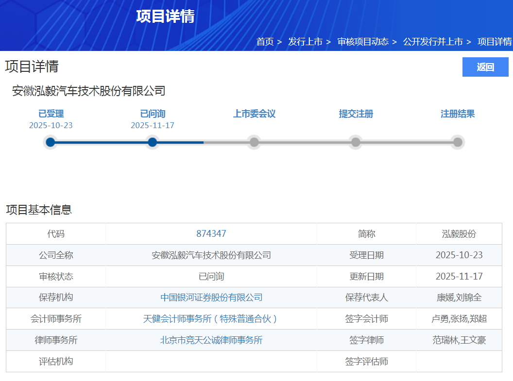 北交所网站显示,安徽泓毅汽车技术股份有限公司(以下简称“泓毅股份”)于11月17日更新上市申请审核动态,北交所下发第一轮审核问询函,直指单一大客户依赖、关联交易占比高、收入确认是否准确、毛利率为何逆势上扬等问题。